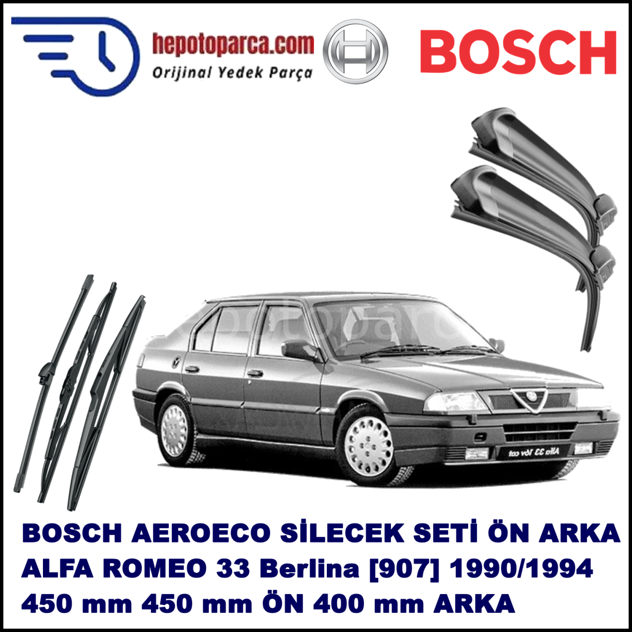 ALFA ROMEO 33 Berlina [907] 01,1990-10,1994 Bosch Aeroeco Ön ve Arka Silecek TakımıALFA ROMEO 33 Berlina [907] 01,1990-10,1994 Bosch Aeroeco Ön ve Arka Silecek Takımı AE 45 AE 45 H 400 (önler 450/450 mm, arka 400 mm,), BOSCH, HEPOTOPARCABosch-3 397 013 450-3 397 013 450-3 397 004 757-1